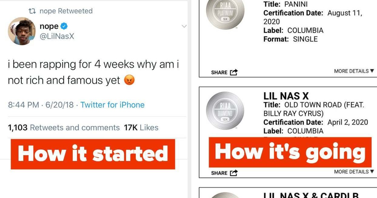 3. Lil Nas X shared a tweet from 2018 lamenting not being rich and famous yet next to his platinum and diamond certifications: